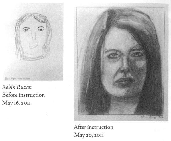 These pre-existing skills have nothing to do with potential to draw well. What the pre-instructions drawings represent is the age at which the person last drew, often coinciding with the age at which the person gave up trying to draw.