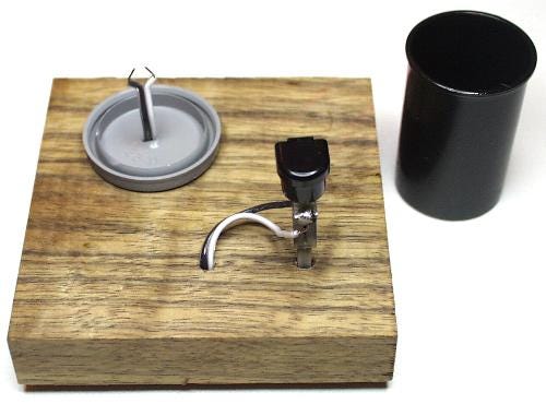 The cannon is very simple. A pair of wires are pushed through a slit made in the top of a plastic 25 millimeter film can. The other end of the wires are soldered to the igniter element from an electronic cigarette or fireplace lighter. I chose to mount these elements on a block of wood, but this is optional if you’re in a hurry.