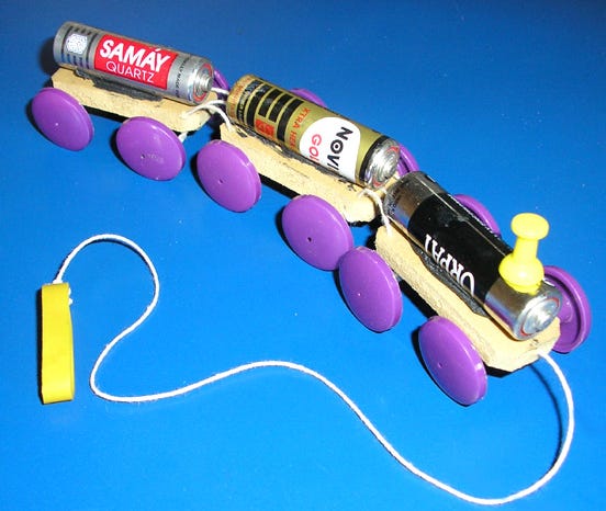 The toy is very easy to make, going together in about 15 minutes, at a cost of two or three dollars if all the parts are purchased new, or free if you don’t throw away certain common household items.